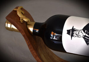 Gecko auf Olivenholz- Flaschenhalter.www.maiersgoldschmiede.com