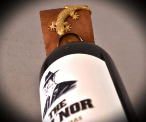 Gecko auf Olivenholz- Flaschenhalter.www.maiersgoldschmiede.com
