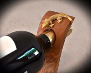 Gecko auf Olivenholz- Flaschenhalter.www.maiersgoldschmiede.com
