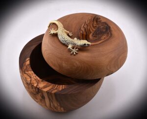 Gecko auf Olivenholz- Dose.www.maiersgoldschmiede.com