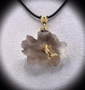 Gecko aus Rauchquarzblüte-Anhänger.www.maiersgoldschmiede.com
