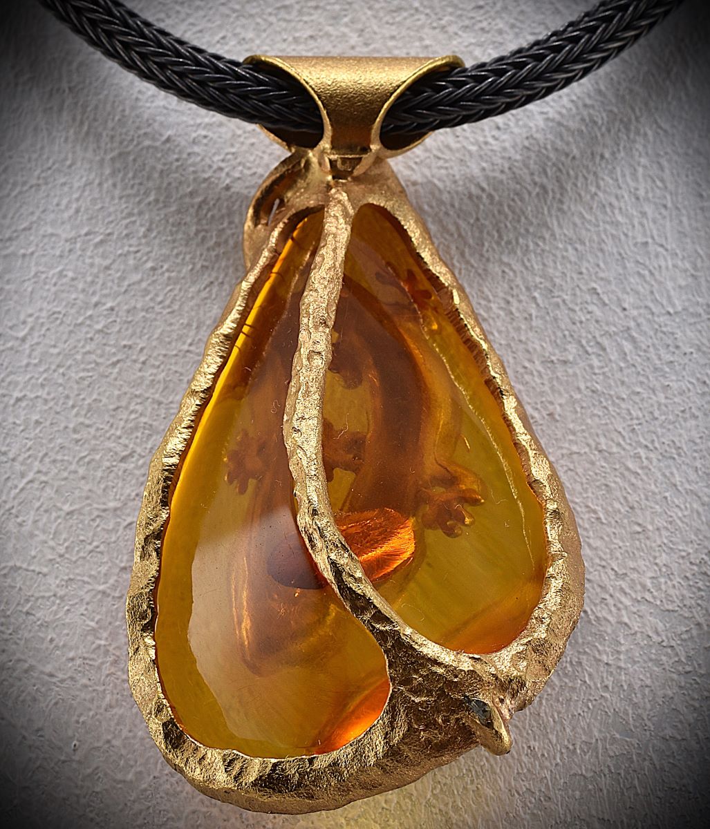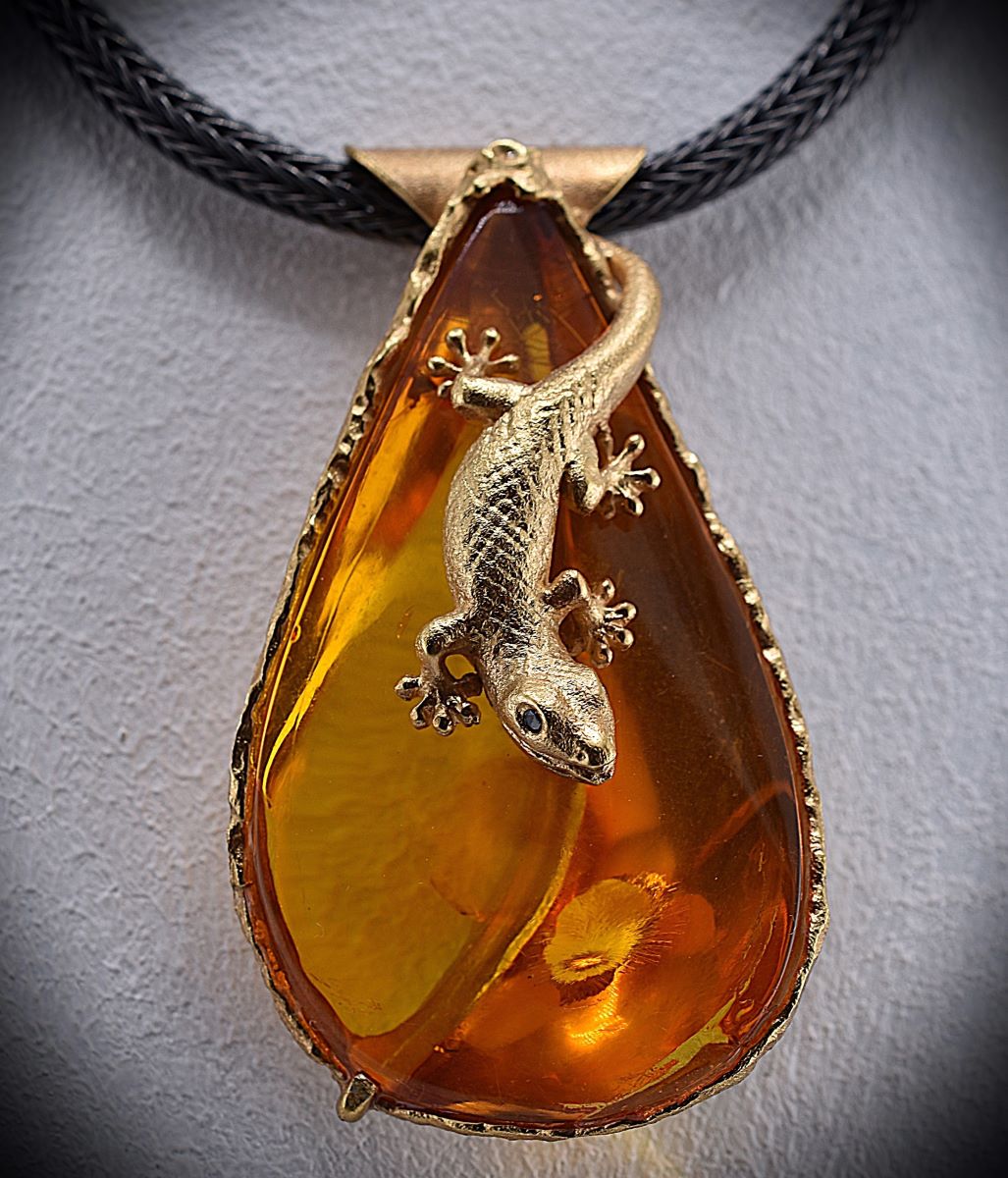 Gecko auf Bernstein – Anhänger – UNIKAT